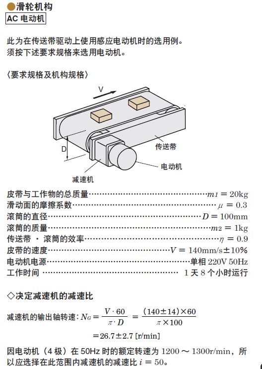 這個(gè)圖中的電機(jī)直連減速機(jī),減速機(jī)輸出軸上是皮帶傳動(dòng)的滾筒,所以,減速機(jī)輸出軸的轉(zhuǎn)速=皮帶傳動(dòng)的滾筒軸的轉(zhuǎn)速。轉(zhuǎn)速公式由w=2pai*n w=v/r=2v/D 2v/D=2pai*n n=2v/2pai*D=v/pai*D 前面的60是單位換算時(shí)出來(lái)的量綱系數(shù),你自己推導(dǎo)一下。 你沒(méi)看明白,還是有些概念沒(méi)弄明白。 |