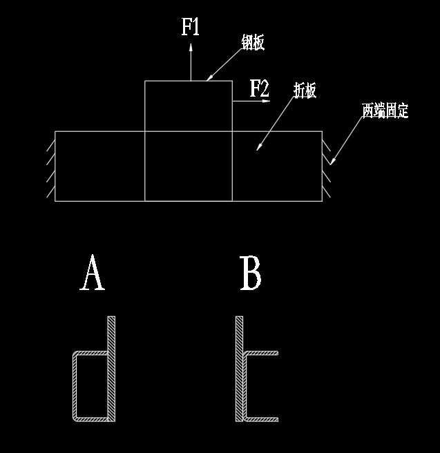 折板長1米,鋼板0.18米,根據(jù)鋼板定位,F(xiàn)1和F2受力,分別對A圖截面和B圖截面尺寸算下強(qiáng)度,再確定是A,或者B 選A圖,確定封閉截面長度,以及焊接工藝,另外,如果F1,F2和鋼板不在一個平面內(nèi),F(xiàn)1或F2產(chǎn)生的分力,是否需要考慮 |