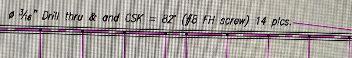4樓說的比較明白,我理解的是:第一個是3/16”的沉頭通孔((比M4大一點,),沉頭角度是82°,裝的時候用#8的螺釘,有14處; 第二個估計在其他視圖,要是沒其他視圖,你可以按比例自己算一下, |