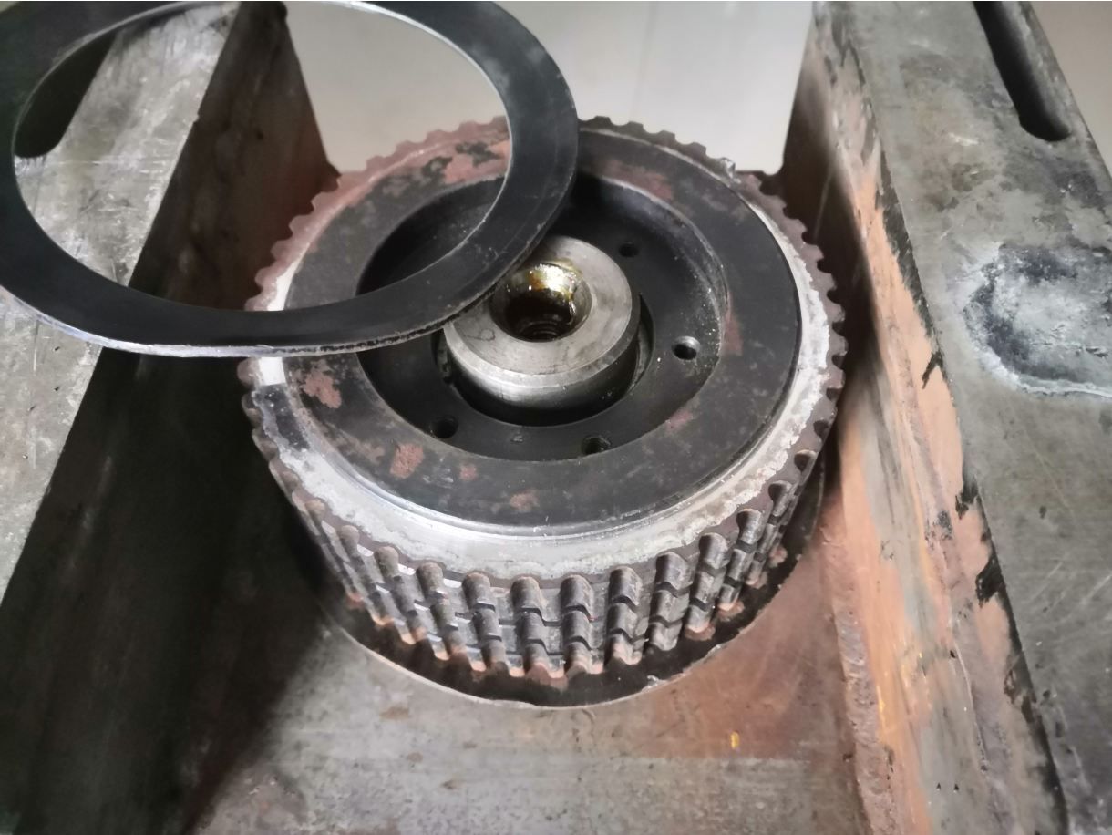 | 這是脹套式的同步輪,六顆螺釘拆了,向里震動(dòng),就松了,這和加工中心換刀臂結(jié)構(gòu)一樣! |