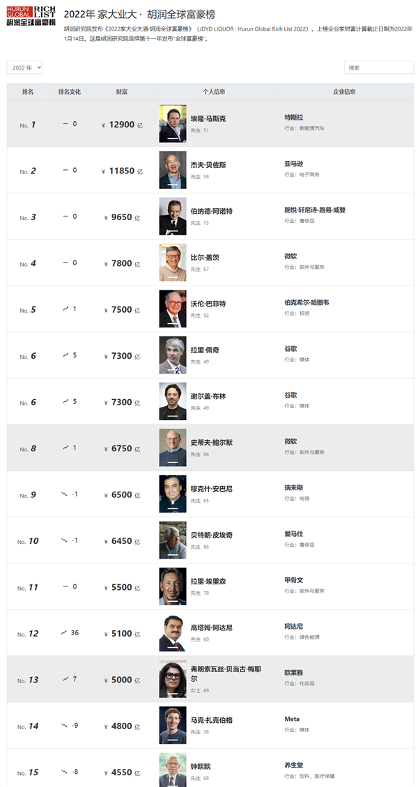 正文摘要:2022胡潤全球富豪榜出爐了,馬斯克蟬聯世界首富:身價1.29萬億。一起來看看排行榜上都有誰——6 e0 T* {* `( F3 z# k# A; m( Z . s5 D+ i# O* P) ~ |