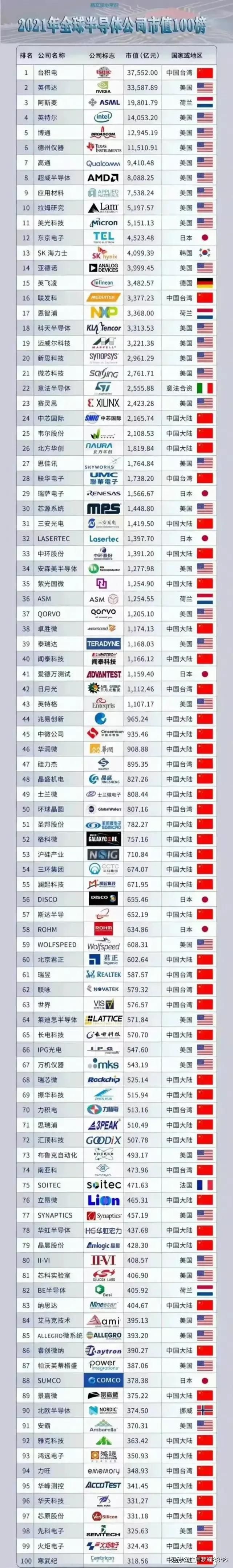 正文摘要:據(jù)最新統(tǒng)計數(shù)據(jù)顯示,全球半導體市值百強公司,中國占據(jù)50家,其中臺灣11家,臺積電排名第一,大陸企業(yè)排名相對靠后,但是未來潛力也很大,華為海思沒有上市未統(tǒng)計,三星是綜合在一起也未獨立統(tǒng)計。 ... |
