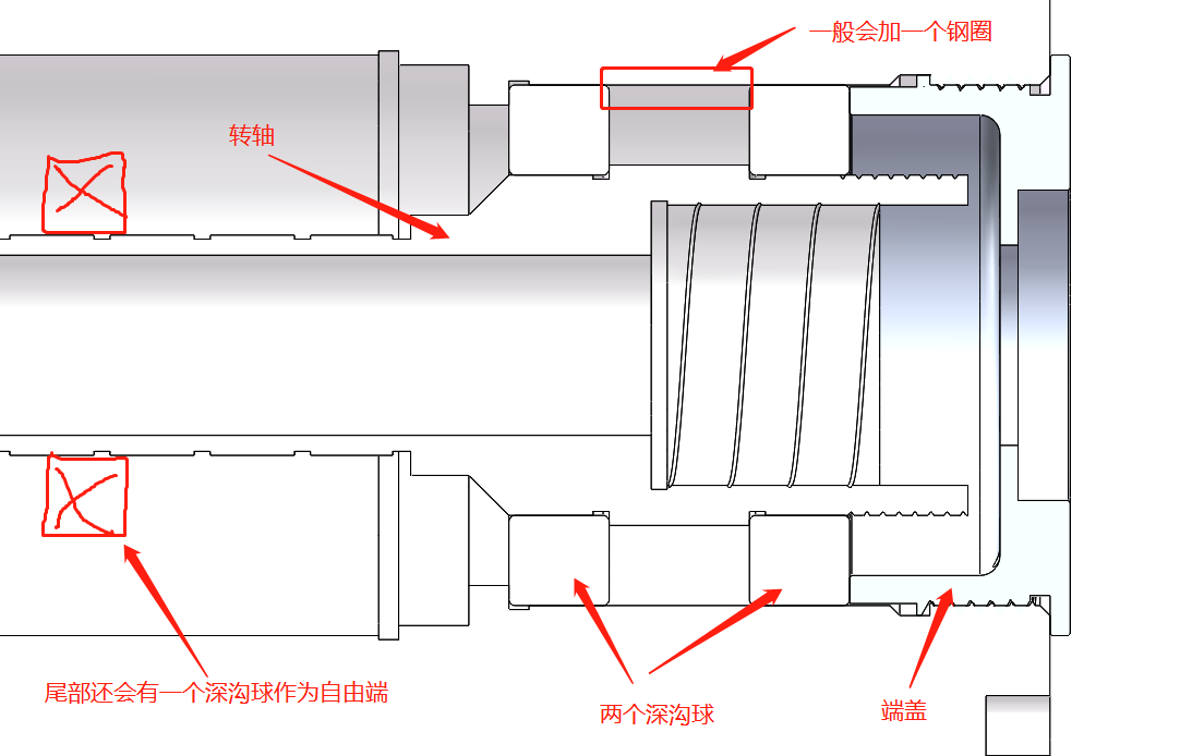 正文摘要:最近應用一個雙軸承結構時突然想到一個問題,如圖:兩個深溝球軸承構成固定端,然后另一端再來一個深溝球為自由端,通過在最右邊端蓋處添加調隙墊片來調隙,那么兩個軸承外圈中間那個套圈有什么用呢?感覺好像沒有套 ... |