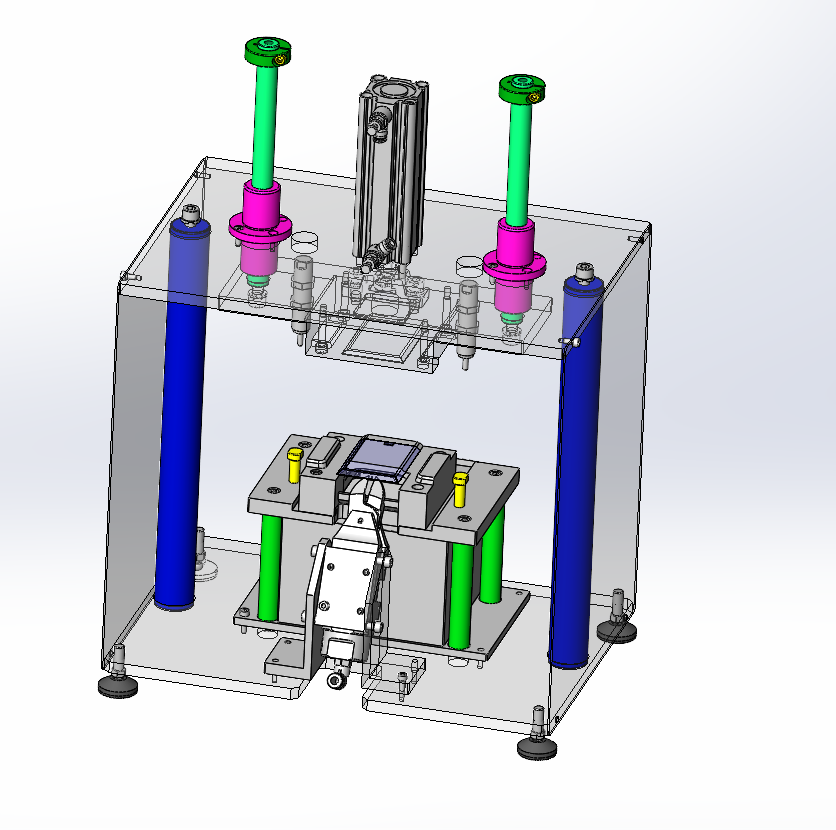 似乎是手機殼一類的注塑產品剪水口? 氣動剪刀沒有微調設計,廢料沒有收集排放,可以增加自動出料設計,框架式設計阻礙人工入料,沒必要下壓式固定工件,邊上一個杠桿下壓結構或者旋轉下壓結構就行了。 |