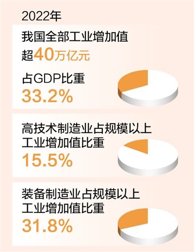 正文摘要:【去年我國全部工業增加值超40萬億元】2022年,我國全部工業增加值突破40萬億元大關,占GDP比重達到33.2%;其中制造業增加值占GDP比重為27.7%,制造業規模連續13年居世界首位。 ... |