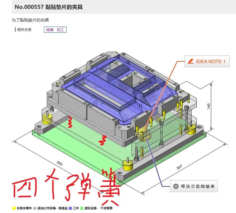 正文摘要:整體結(jié)構(gòu)如圖一所示,平臺下方有彈簧,放上工件時不會下沉。需要人手動在上方施加壓力才會下降,彈簧從預(yù)壓縮位置開始再壓縮15mm時視為荷重達標。工件分為上下兩個部分,機構(gòu)本身實現(xiàn)的功能是將上下兩工件粘緊。 官 ... |