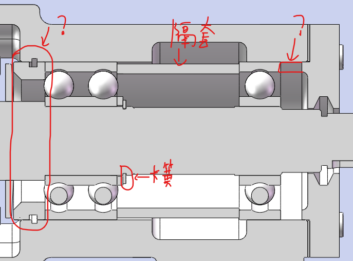 右邊要頂到軸承邊,左邊的話看看你左面后面的部位有沒有密封了 假如左面已經有密封那這個蓋和槽都可以不要,要是沒有密封的話留個蓋,把密封加上就行了。其他的話,中間的隔套改小,把中間卡簧槽去掉,隔套內徑和軸外徑配合,然后直接去頂軸承。當然中間就這樣不改也行。 |