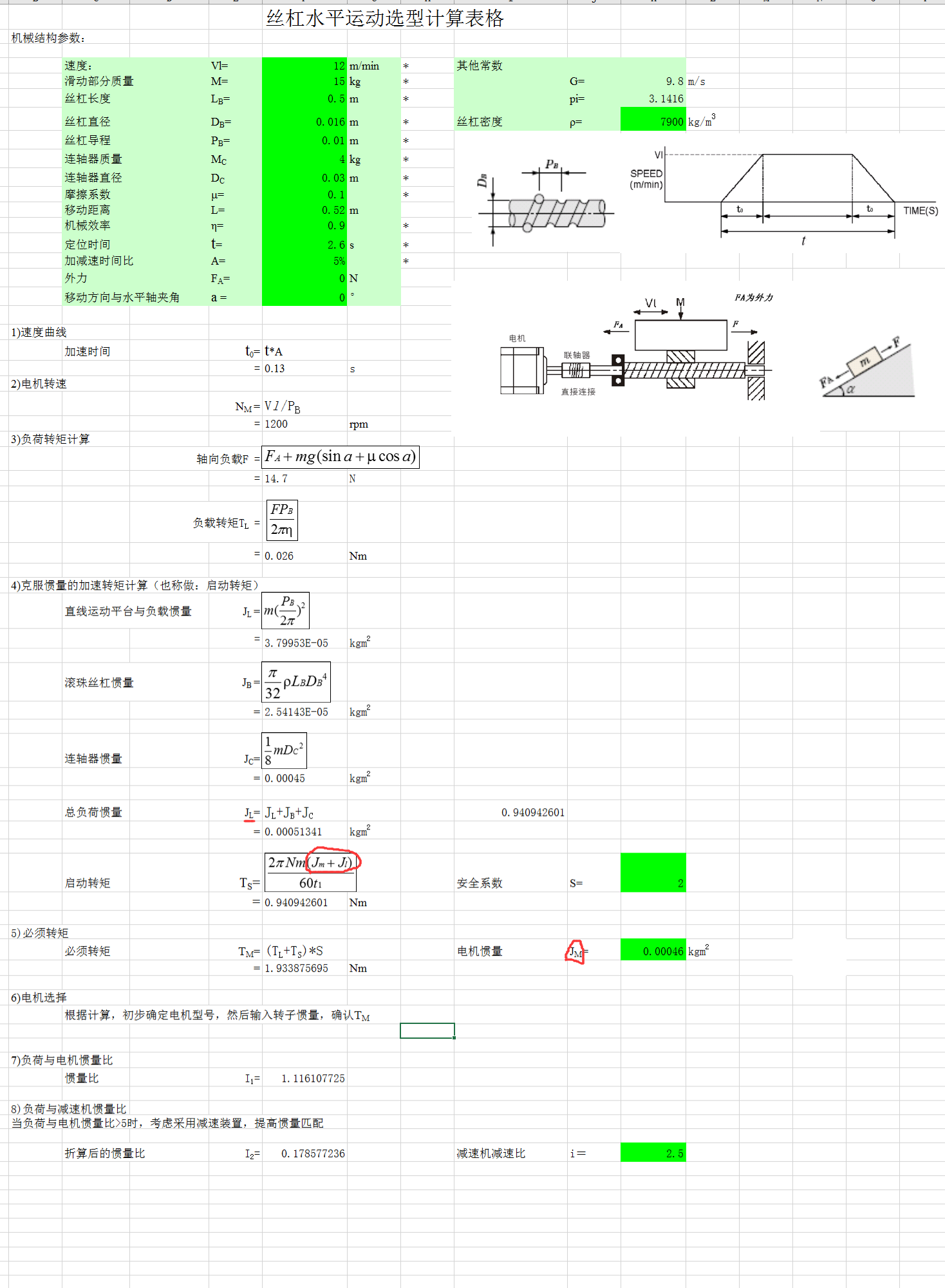 | 負載慣量是不含電機慣量的。電機參數里一般會有推薦的慣量比。 你圈出的地方是計算啟動扭矩的。如果選伺服電機的一般先計算負載慣量。根據慣量選電機。根據扭矩確定減速比。最后復核速度。 |