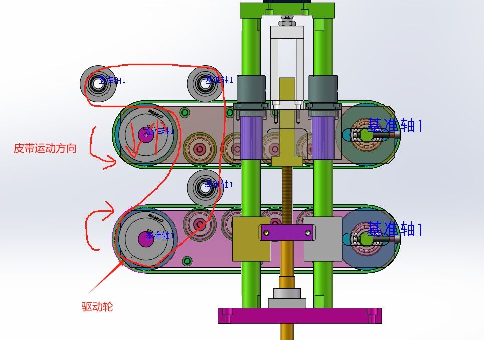 這個是兩個多鍥帶輸送的機構(gòu),目前想用一個動力去驅(qū)動兩個皮帶,而且上面的那一組多鍥帶組是要上下動作的?,F(xiàn)在想到的是用雙面帶齒的同步帶,然后用如圖的繞法去驅(qū)動,我感覺是可以的, 但是我這樣感覺做出來有點突 ...