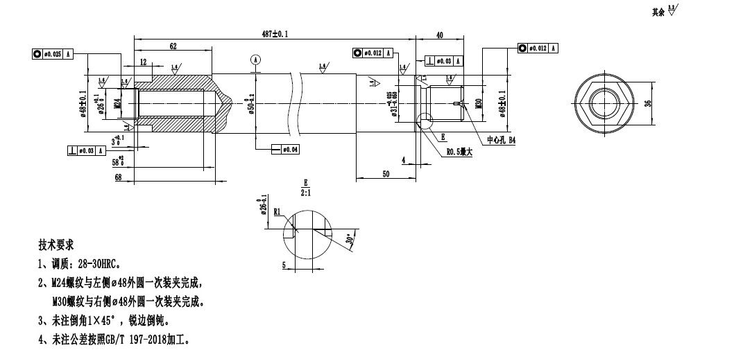 | 這也沒有別的辦法,只能分兩頭加工,粗車后把中間50夾住,兩端都用表把跳動打好找平后夾緊了車吧。基本就是默認為車螺紋前大/小徑的跳動。 |