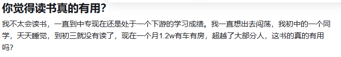 | 讀書對窮人理想有用,但并不妨礙對于富足的人來說,讀書只是錦上添花。讀哪種書算是讀到書,讀書根本就沒有界定標準,掌握多少程度就靠做卷子嘛?很討厭互聯網的一點就是兩撥傻逼總要試圖說服對方。對人生和追求哪能單純套模板。 |