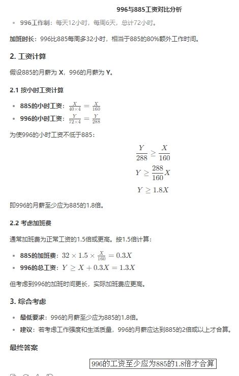 顯然deepseek還不夠人性化,看看通義大模型的回答 "996"和"885"通常是指工作時間安排,其中"996"代表早上9點到晚上9點,每周工作6天的工作制度;而"885"則指早上8點到晚上8點,每周工作5天的工作制度。要確定這兩種工作制度在工資上的合理性比較,并沒有一個固定的答案,因為這取決于多種因素,包括但不限于個人的價值觀、生活需求、對工作的熱情、職業(yè)發(fā)展考量等。 然而,從經(jīng)濟角度來看,如果要粗略地比較兩者之間的工資差異來判斷合算與否,我們可以考慮如下幾個方面: 總工作時長:首先計算兩種模式下的總工作時長。以每周為單位,“996”大約是72小時(12小時6天),而“885”則是60小時(12小時5天)。) B$ T% g: S+ b 時薪計算:如果你知道具體的月薪或年薪數(shù)額,可以將其轉(zhuǎn)換成時薪來進行比較。假設A工資是“996”模式下的月薪,B工資是“885”模式下的月薪,則可以通過以下公式計算各自的時薪:1 e& c; {; Q5 Q 996模式下的時薪 = A / (72小時 * 每月大約的工作周數(shù)) 885模式下的時薪 = B / (60小時 * 每月大約的工作周數(shù)) 性價比考量:考慮額外的時間投入是否帶來了足夠的經(jīng)濟回報。例如,若“996”的時薪顯著高于“885”,那么可能在經(jīng)濟上看起來更“合算”。但是,還需要考慮工作與生活的平衡、健康影響等因素。; N/ L) E/ W( t( g; ^% N/ _ 非金錢因素:除了直接的經(jīng)濟補償外,還需考慮其他福利、職業(yè)發(fā)展機會、工作滿意度等非金錢因素。' |+ ?! j! X! @ 綜上所述,沒有具體數(shù)值的情況下很難給出確切的答案。每個人對于“合算”的定義也不同。重要的是根據(jù)自己的實際情況和優(yōu)先級來做決定。 |