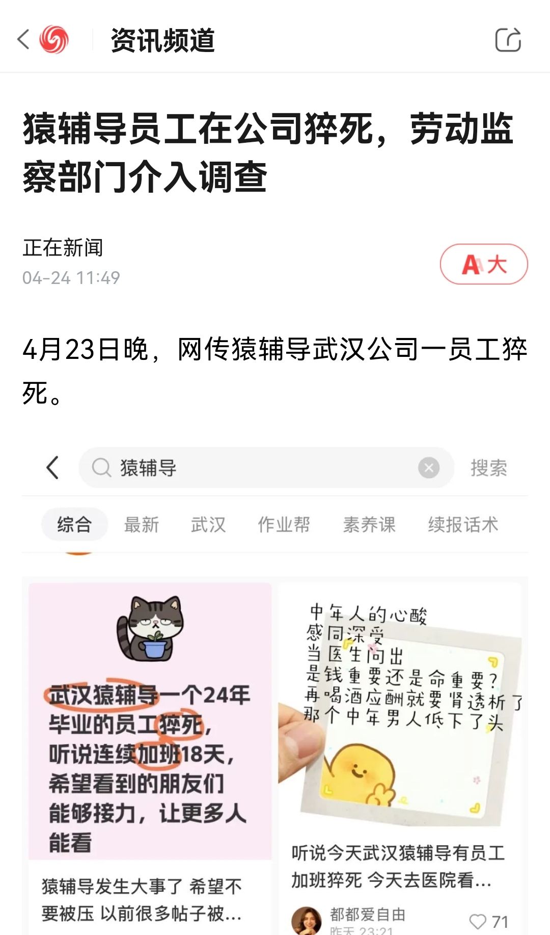 | 園區的一家公司最近也是在鬧,據說是員工在宿舍猝死了。 |