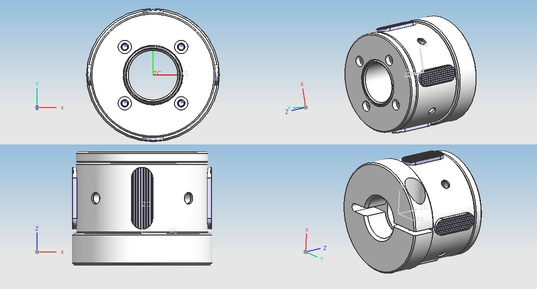 本帖最后由 lhjian 于 2011-12-10 19:54 編輯 在旋轉時頂爪會因離心力向外伸出,同時凸輪主體和頂爪產生相對位移也會使頂爪向外伸出,使頂爪將紙筒漲緊帶動旋轉。在一些要求漲緊力小旋轉速度高的情況下也可以不使用凸輪結構,僅靠旋轉時頂爪產生的離心力都可以滿足使用要求。轉動停止時沒有了離心力也就沒有了漲緊力就松開了。套上的四個小孔是保證套和凸輪主體同軸防止產生大的位移,應該有四個柱端頂緊定螺釘安在這里,柱端與凸輪主體凹槽為間隙安裝。 |