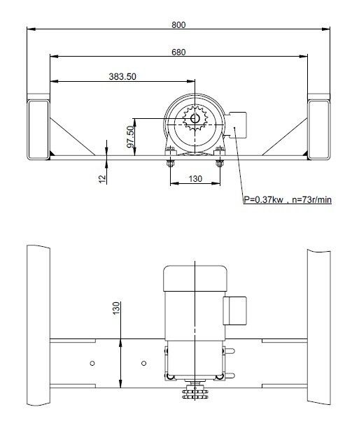 | 馬達(dá)功率0.75kw,轉(zhuǎn)速73r/min,底板長680寬130厚12兩側(cè)邊還有加強(qiáng)筋板,不會造成彎曲,顫動也不會大。 |