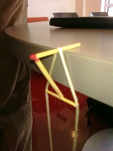 | 我試過了,如果上圖中線離開了桌面是掛不住的。主要受力點在線和桌面接觸面上。而不是三根火柴。 |