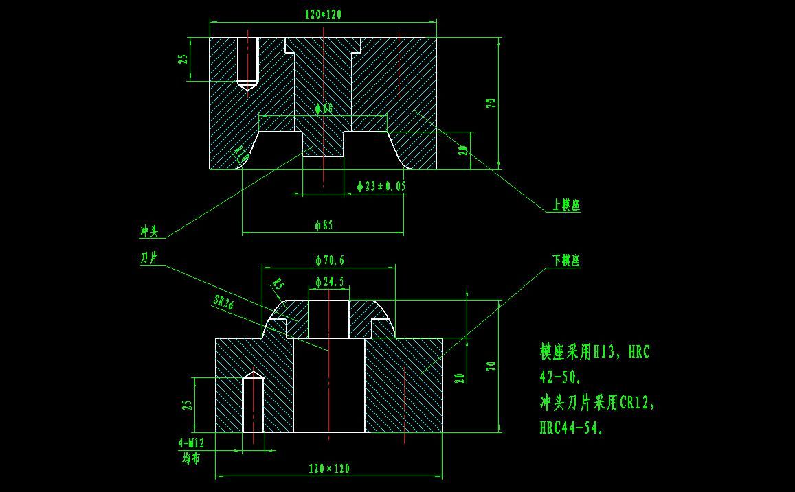 建議樓主將帖子轉到模具板塊,那里有很多沖壓模具的高手! H13一般應用于塑料注射模,特別是金屬壓鑄模。屬于熱作模具鋼。這樣的金屬材料,屬于中碳鋼,強度高,但是硬度作為沖壓模具來說就偏軟了。10MM的板材沖壓,估計沖壓力很大,產生塌陷有可能。改用CO12MOV應該是正確的。 另外針對不同的材料的熱處理工藝,建議樓主應該征求專業熱處理供應商的專業建議以及材料生產商的技術資料說明。各類材料的熱處理數據及相關曲線很容易找到的。 有關模具結構,因為你的圖紙不是很清晰,故暫不做評價了。 |