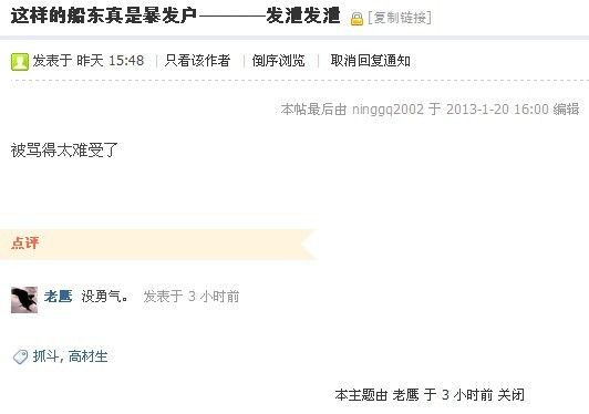 哇哇,我還以為什么大事呢。 不就是在論壇里嘛。要知道,發一個帖子,肯定有人叫好,有人拍磚的,就算哪天你遇到有人拍磚的,那又有什么大不了的? 正反的評論都有,看事情才比較全面,比較客觀。當然接不接受是自己的事了,,, |
