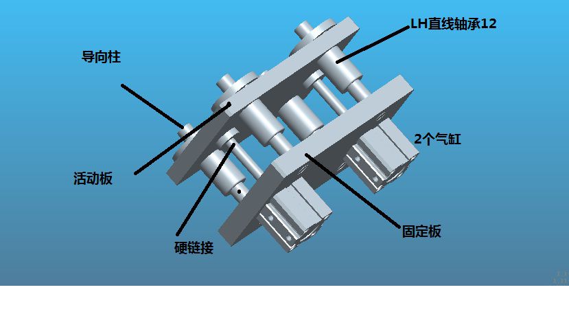 | 這種結構可以用,不過對加工和調試要求很高。氣缸桿改個浮動連接就行了,用直線軸承了就不用考慮兩個氣缸同步不同步,反正都會一起走的。 |