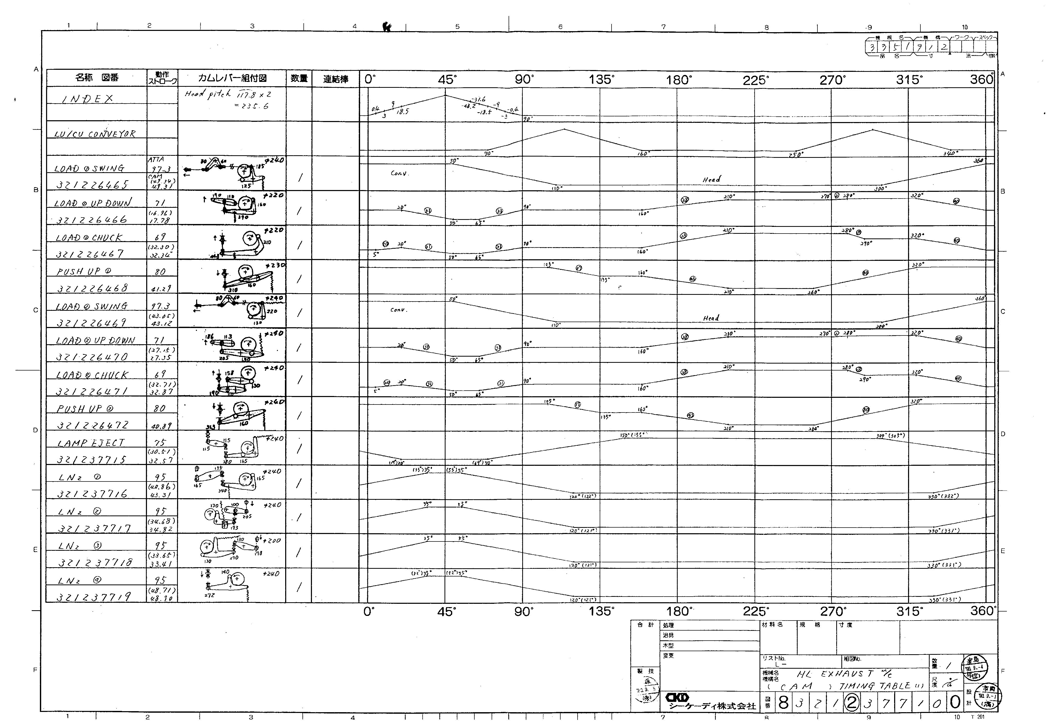 | 凸輪的動(dòng)作時(shí)序和擺件的行程控制圖,可以用這張圖把所有的凸輪結(jié)構(gòu)畫(huà)出來(lái)。如果要用到凸輪控制最好先畫(huà)一張這樣的圖。幾十年歷史的設(shè)備依然跑的很溜,零件一個(gè)沒(méi)壞,壞的都是電氣用品和氣缸之類的 |