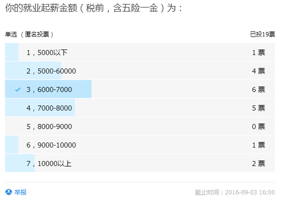 正文摘要:這是2016年畢業的某211學校(我老師統計的數據,還沒統計完)機電研究生剛畢業的工資,大概還有20多個人沒調研到,聊聊你們剛畢業時候的工資。我感覺我是拉后腿了(我是其中6000~7000) 3 P6 {) e" a3 P; W ... |
