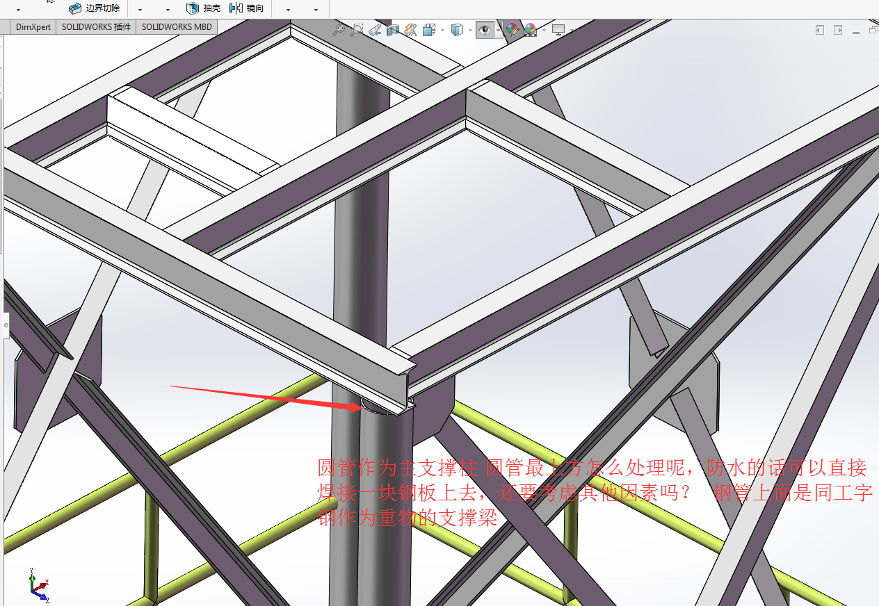 正文摘要:鋼架最上方放置沙克龍,承重柱是用的152x6的圓管,最上方是用14#工字鋼作為承重梁,請(qǐng)問(wèn)圓管與工字鋼之間怎么連接比較合適 |