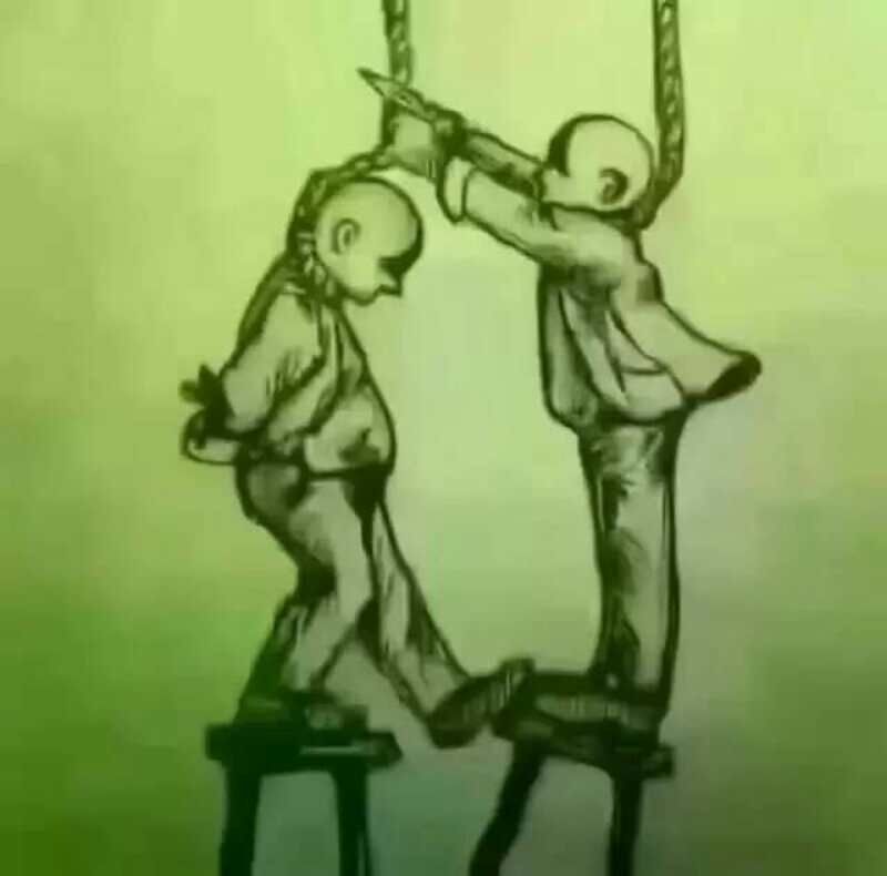 本帖最后由 周震 于 2017-3-1 13:33 編輯 , G# y: W0 r0 z0 g 強勢群體 對待 弱勢群體 以為自己獲利了,最終只會多行不義必自斃 不過第一幅圖 感覺是瘦子 在吊著的狀態底下凳子是不好站的,所以胖子把凳子撐的傾斜點,給瘦子好站立8 R9 @) ?4 ?3 u# l8 F/ N! b& z |