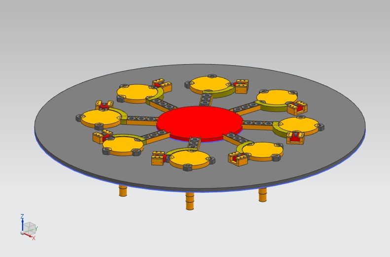 正文摘要:圖片中有八個(黃色的)工作區。待加工產品集中在中心(紅色)區域,分別通過八道流轉槽向加工位輸送。用怎樣的裝置來實現待加工件從紅色區向黃色區派發? ... |