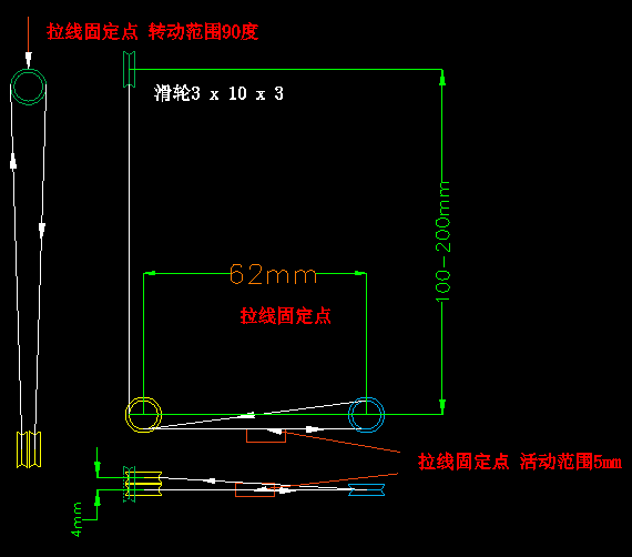 正文摘要:如圖,希望設(shè)計(jì)一個(gè)比較短的拉線(xiàn)控制結(jié)構(gòu),綠色是輸入控制的滑輪,紅色是被控制的滑塊,一共4個(gè)滑輪,黃色和藍(lán)色滑輪用于過(guò)線(xiàn)。線(xiàn)的總長(zhǎng)度大約300mm,滑動(dòng)位移范圍大約5mm,線(xiàn)拉力不超過(guò)10牛,轉(zhuǎn)動(dòng)頻率很低,大概 ... |