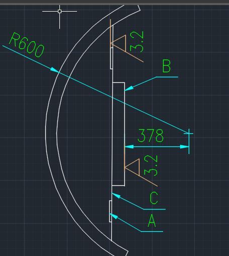 | (我不是搞加工的)這個件是整體的嗎?按照我的想法,1.先精加工B面 2.找出B面中垂線 3.偏移378找到圓心 4.加工R600。我感覺奇怪的是如果R600精度要求不高的話為什么圓心的要求賊高呢? |