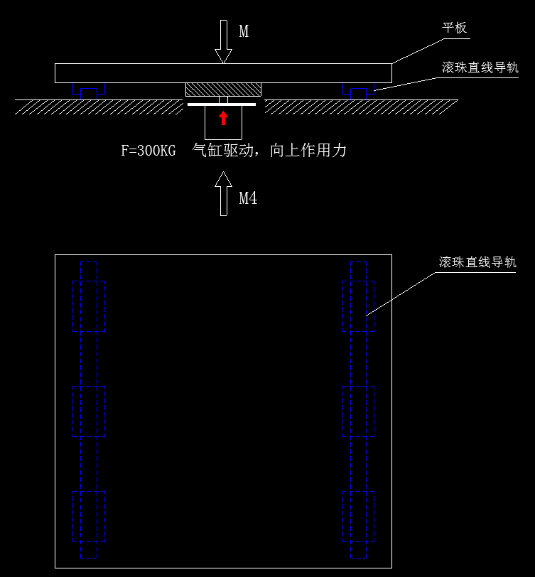 正文摘要:如圖示導軌水平安裝,再兩導軌滑塊上端平鋪一塊板相連,在板的正下方有一個氣缸向上作用力,出力約為300kg,問滑塊所承受力的參考值,選型手冊上給出了M垂直向下的力參數(shù),選用型號為臺灣上銀EGH15C,其靜止負載 ... |