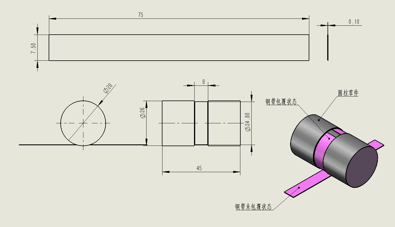 正文摘要:如題,需要做一個(gè)小治具來(lái)實(shí)現(xiàn)將薄鋼片包覆在一個(gè)圓柱體表面,具體零件尺寸見(jiàn)圖,目前沒(méi)有好的思路。 希望前輩們指點(diǎn)一下,謝謝大家。 |