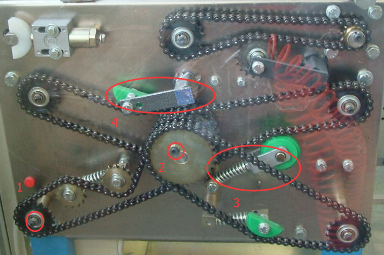 本帖最后由 wayyhlp 于 2018-10-11 09:15 編輯 1可能是單向軸承,4個軸有可能2個用于正轉,2個用于反轉。當然,電機應該會正反轉運行。 2里,應該是軸上有個凸臺,上面有個螺孔,鏈輪安上后,擰緊螺絲,用于軸向緊固。 4的方管里是個橡膠管,通過橡膠的變形來提供扭力。 |
