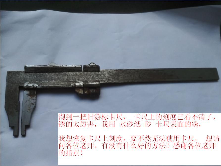 正文摘要:淘到一把舊游標卡尺, 卡尺上的刻度已看不清了,銹的太厲害,我用 水砂紙 砂 卡尺表面的銹,( m; ~5 T2 Y# f) ]6 S6 z 我想恢復卡尺上刻度,要不然無法使用卡尺, 想請問各位老師,有沒有什么好的方法?感謝各位老師 ... |