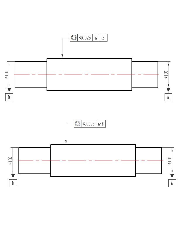 第一種應該是該面分別與A、B同心0.025,A、B本身無直接同心關系,A、B誤差可能達到0.05; 第二種是該面與A、B理論軸線同心0.025,對A、B實際位置、誤差無具體要求 |