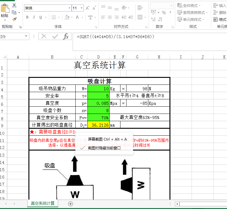 你用的應(yīng)該是妙德Excel版本選型軟件,實際上吸盤尺寸計算理論公式如下: