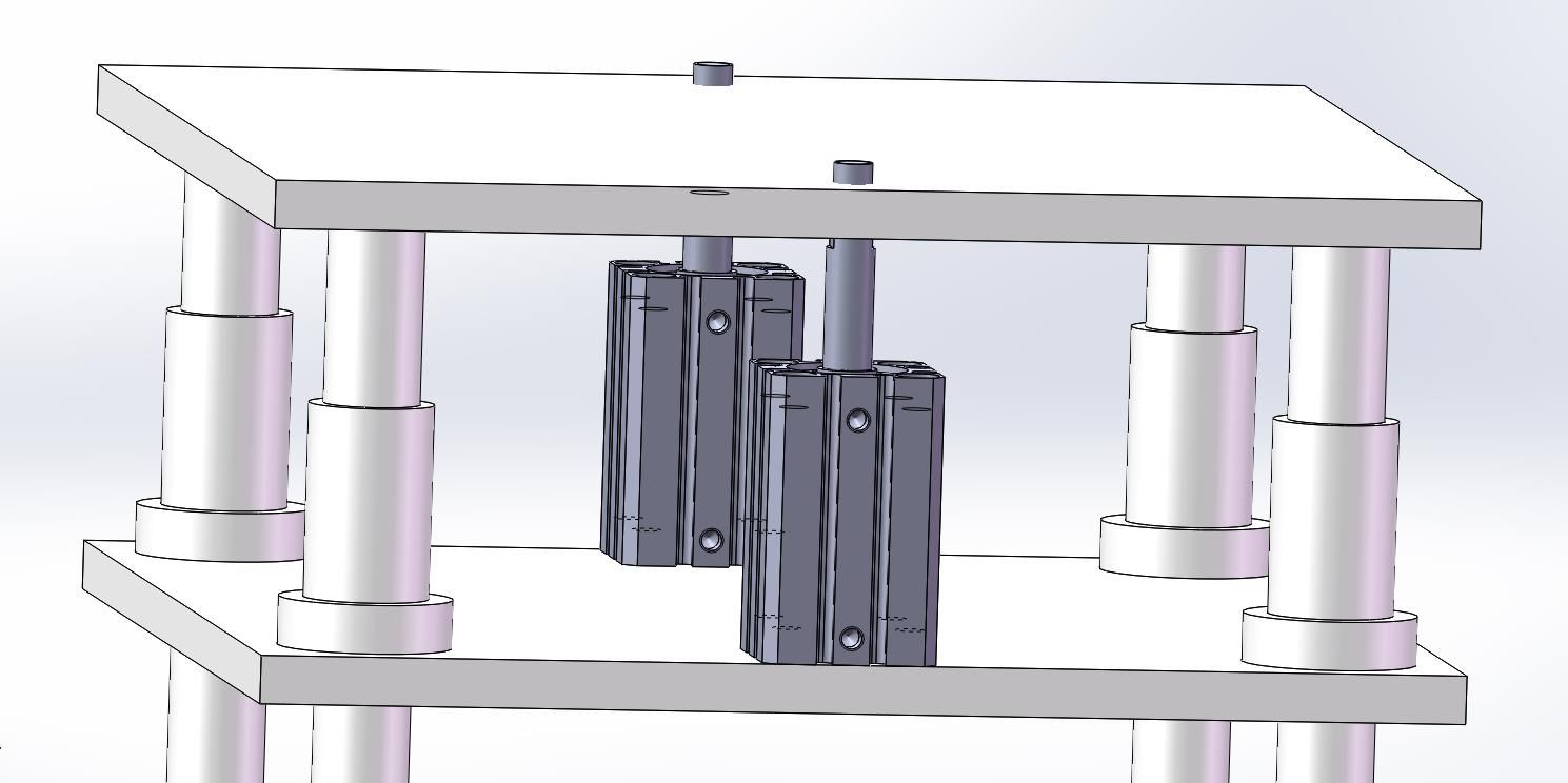| 中間一個氣缸浮動連接,四周直線軸承的開孔要放余量,比如直線軸承外徑30,你的孔要起碼30.5 |