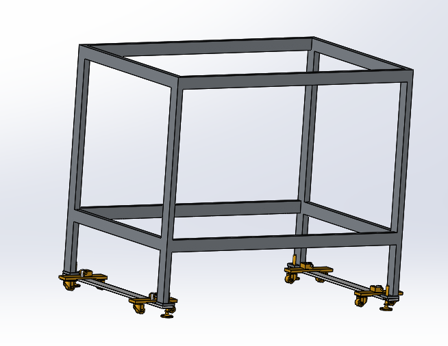 1.可以去掉地腳,選用帶剎車的輪子 2. 輪子安裝在四根柱子的正下方,載荷主要通過這四根柱子傳導到地面,最好保持力的作用線是共線,不要增加額外的轉矩 3.目前這個結構是平行四邊形結構,受力不太好,易變形,最好加一些斜拉筋或十字交叉筋 4. 輪子要再校核一下 |