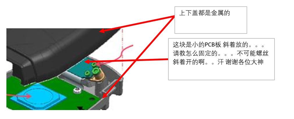 | 斜著的PCB板結構上看像是鉚釘鉚上去的。金屬的蓋上留盲孔就可以。只是底蓋壓鑄模具要多加個抽芯。 |