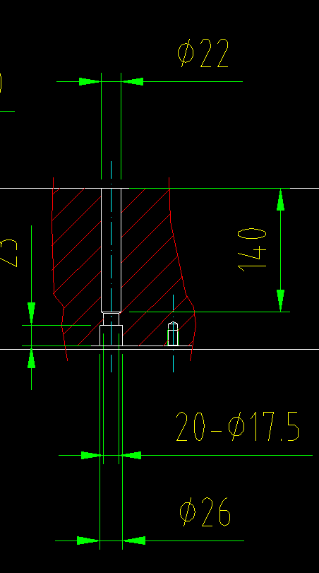 | 圖一, 下面26鏍釘沉孔,17.5是過螺孔,上面22,由于深度140,怕加工是孔位打偏,位置會偏差做的,如果這個深度,17.5孔位不偏差,22的孔可以省去,另一種可能,就是定位用。 |