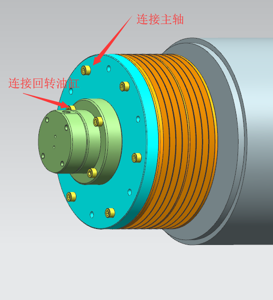 | 綠色的回轉油缸外殼是不轉的,里面有軸承,軸是轉的;里面的軟管從主軸中心穿過,并不會因為主軸旋轉而旋轉,也是不轉的。 |
