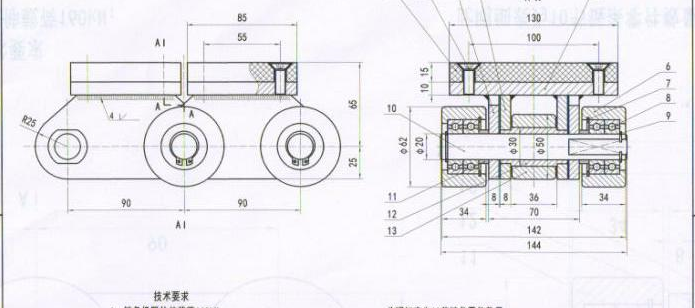 | 圖紙其實就是一個非標鏈的鏈節 節距90,滾子直徑50的低速鏈,單個滾輪承重一噸,應該是其中的部分鏈節滾輪承重(比如一組鏈節下掛)設計。軸承的選擇其實就是根據受力來的,一個軸承承受,那軸承必須大,兩個軸承就可以選小點的軸承。邊滾尺寸必須大于中心滾子(和鏈輪接觸的),如果太大增加重量和成本,畢竟整條鏈最后也不少。鏈條重了,最后說不定鏈輪和電機都得加大,其實是一整套的。所以邊滾盡量小,軸承也盡量小。 |