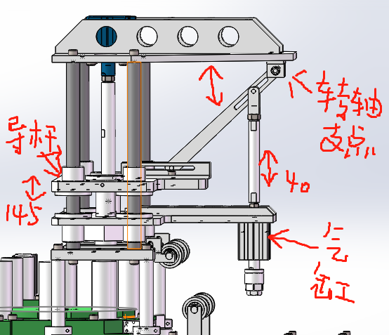 側邊空間那么大,把你那些連桿全部丟掉,嫌電機貴就還是使用氣缸,拉條同步帶上去,掛一個同步輪,搞定,省空間省力 |