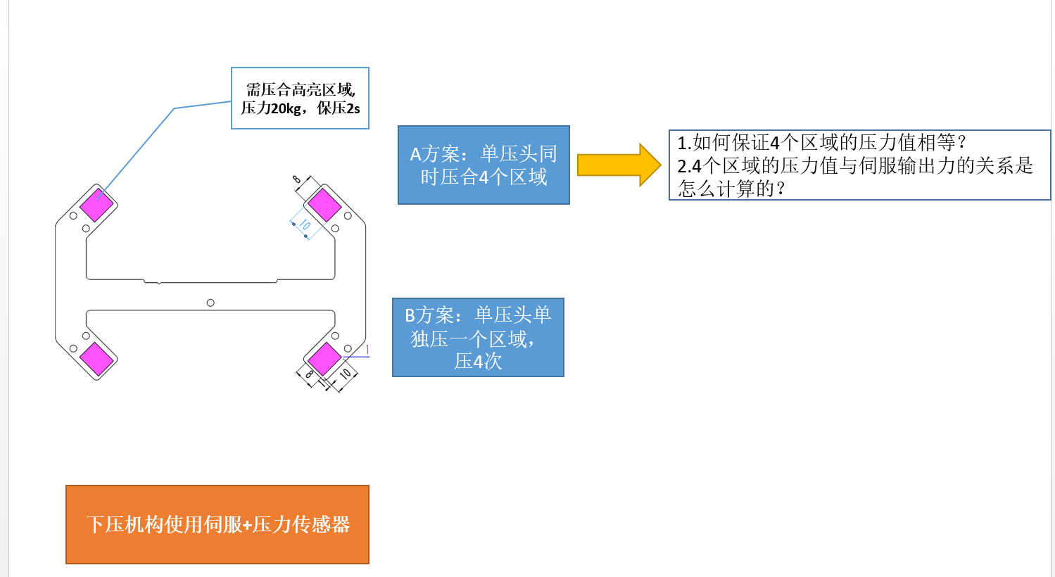 正文摘要:如題,現有PCB板表面需要貼合Flex,要求壓力值20kg并保壓2s。在這里主要想請教一下A方案情況下,4個區域單獨的壓力值該如何計算的呢? |
